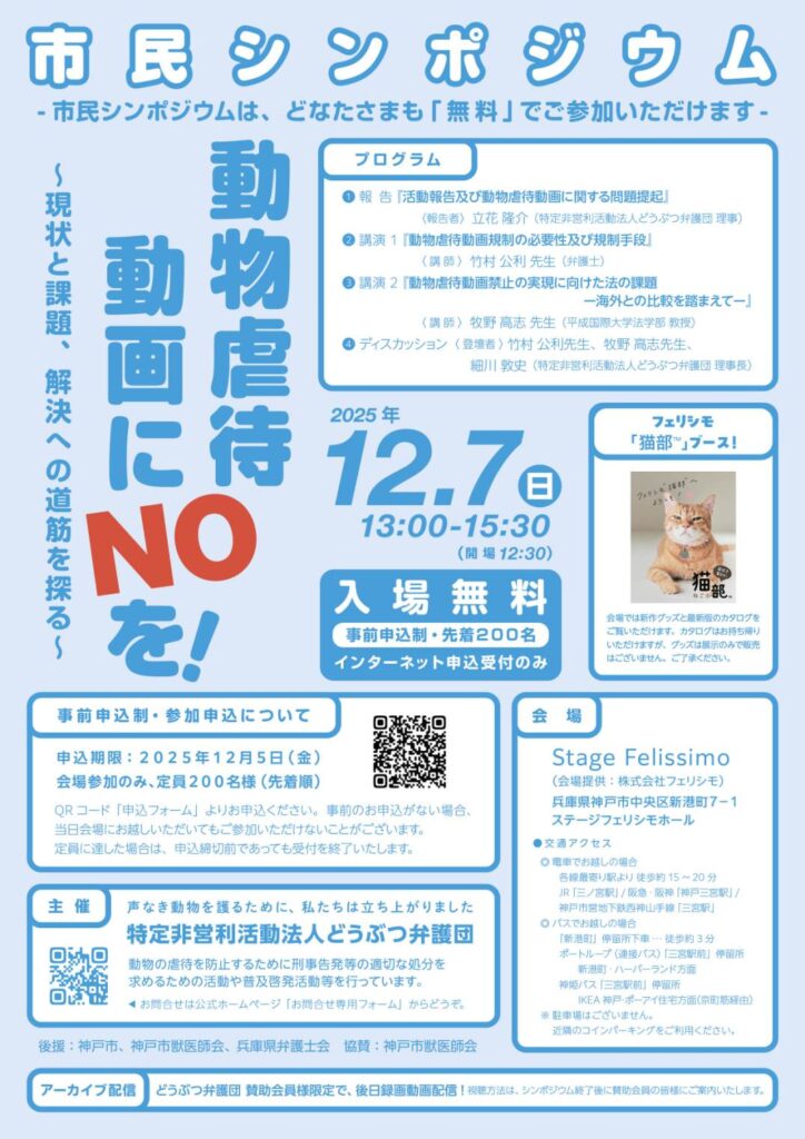 | 主催・後援 | 主催 :NPO法人どうぶつ弁護団 後援 :神戸市、兵庫県弁護士会 後援・協賛:公益社団法人神戸市獣医師会 |