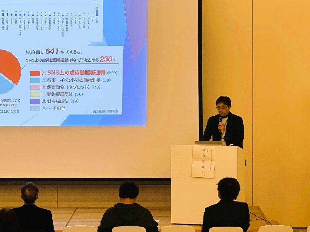 導入として、理事の立花隆介より、当法人に寄せられる情報提供の3分の1がSNS上で蔓延する動物虐待関連の動画であることが、本シンポジウムのテーマ設定のきっかけになったことを説明させていただきました。